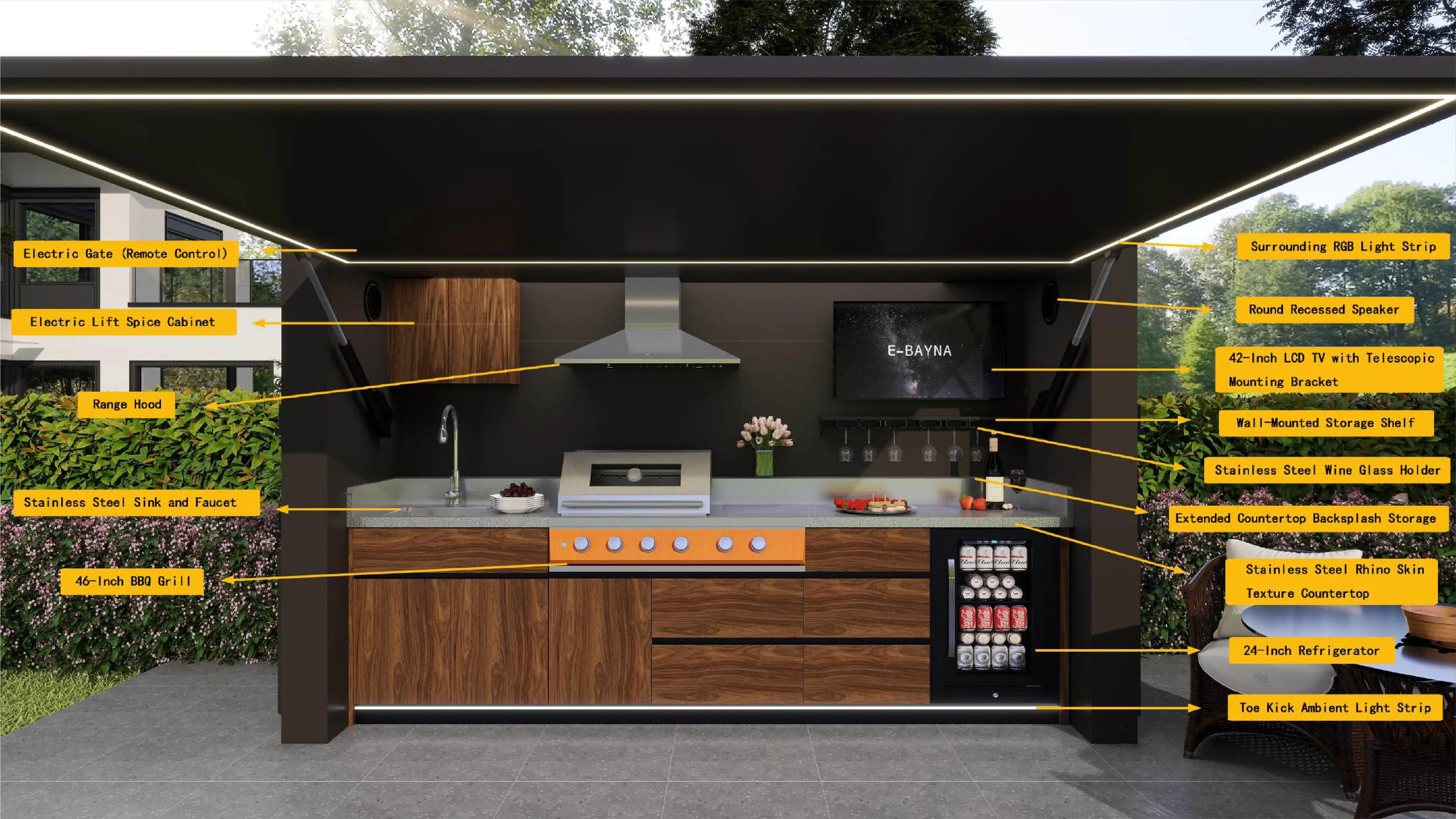 At the centre is a powerful built-in 46" BBQ grill, ideal for cooking for large groups. A 24" refrigerator keeps food and drinks chilled, while the stainless steel sink with pull-out faucet and expansive prep bench make hosting effortless. Wine glass storage, utensil storage, and custom cabinetry finishes elevate both function and style.